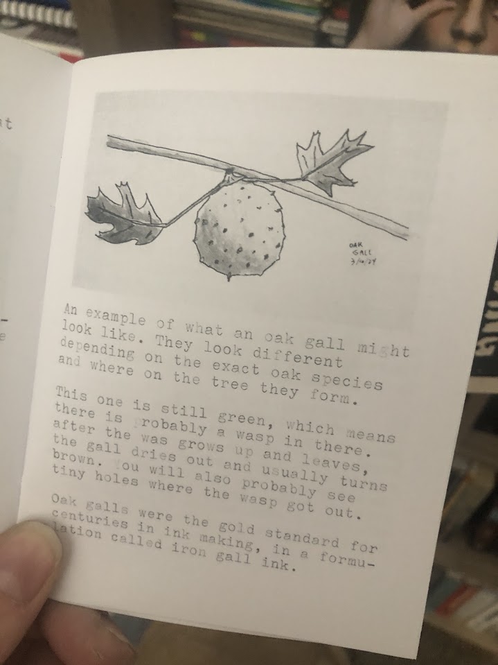 This was my first attempt at making a zine, which featured some short written bits on things I’d read on wikipedia or watched on YouTube but couldn’t stop fixating on, so writing about them for this was a way to “close those tabs.” The cover was a styrofoam relief cut print. The whole thing was typed up on my typewriter and featured some watercolor illustrations, all copied at the library.