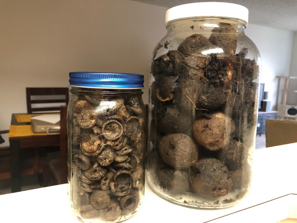 A friend collected a very large batch of walnut husks that had been browning in her yard for months. I used them to make ink. Above you can see I tried various additives, including gum arabic powder, iron sulfate, and wintergreen oil for preservation.