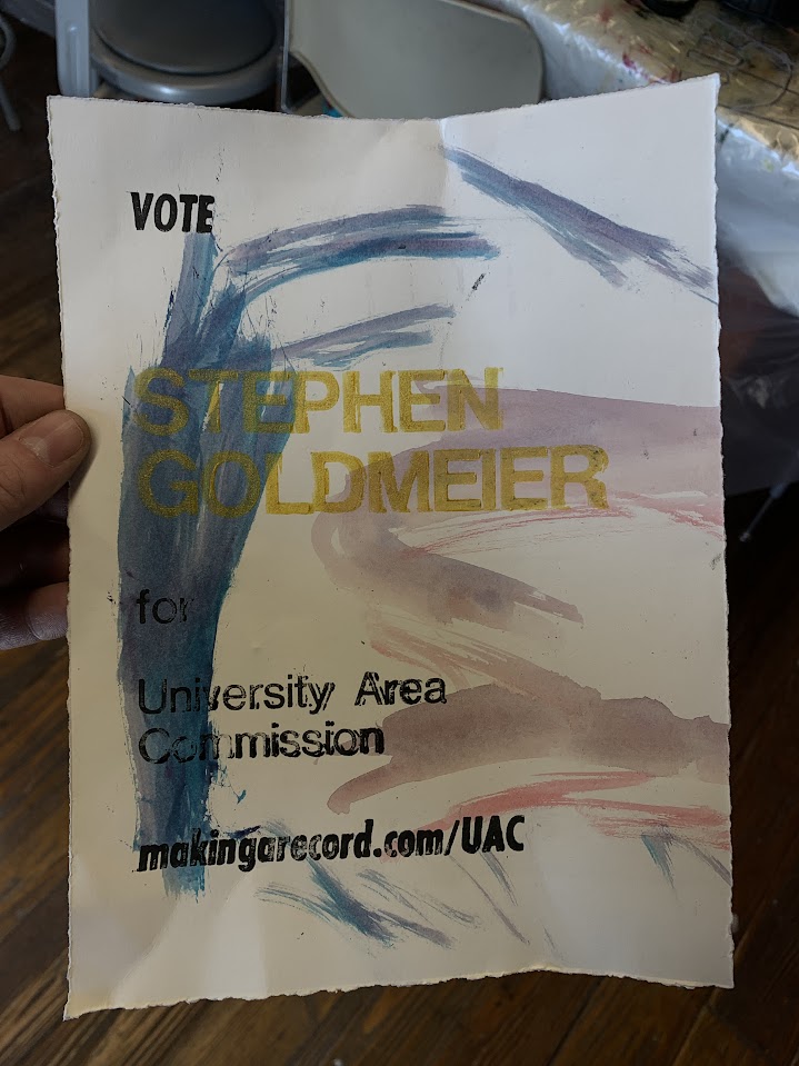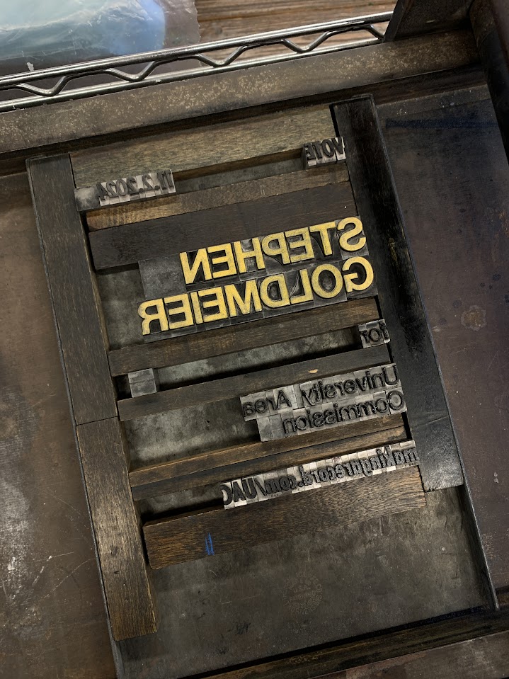 A hand-typeset poster for my race to become an Area Commissioner for the University District. The race was not ultimately successful, but I very much enjoyed printing these posters!