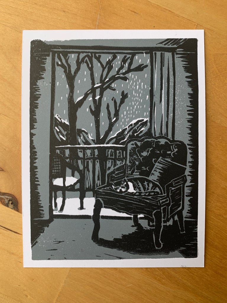 Two layer reduction linocut, Caligo Safewash ink on cardstock.