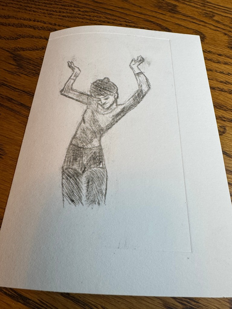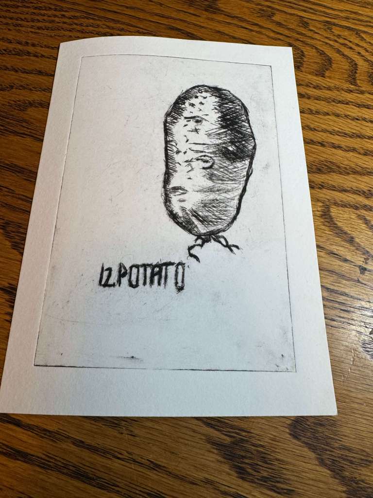 Here’s a potato! It was made using the drypoint etching technique on some scrap plastic with a twisted scribe. I pushed ink into the grooves using chipboard and removed the excess using a specialty wiping fabric. This process uses wet paper to more easily pick up the ink in the grooves. After I did potato, I traced a lady from a Picasso art book!