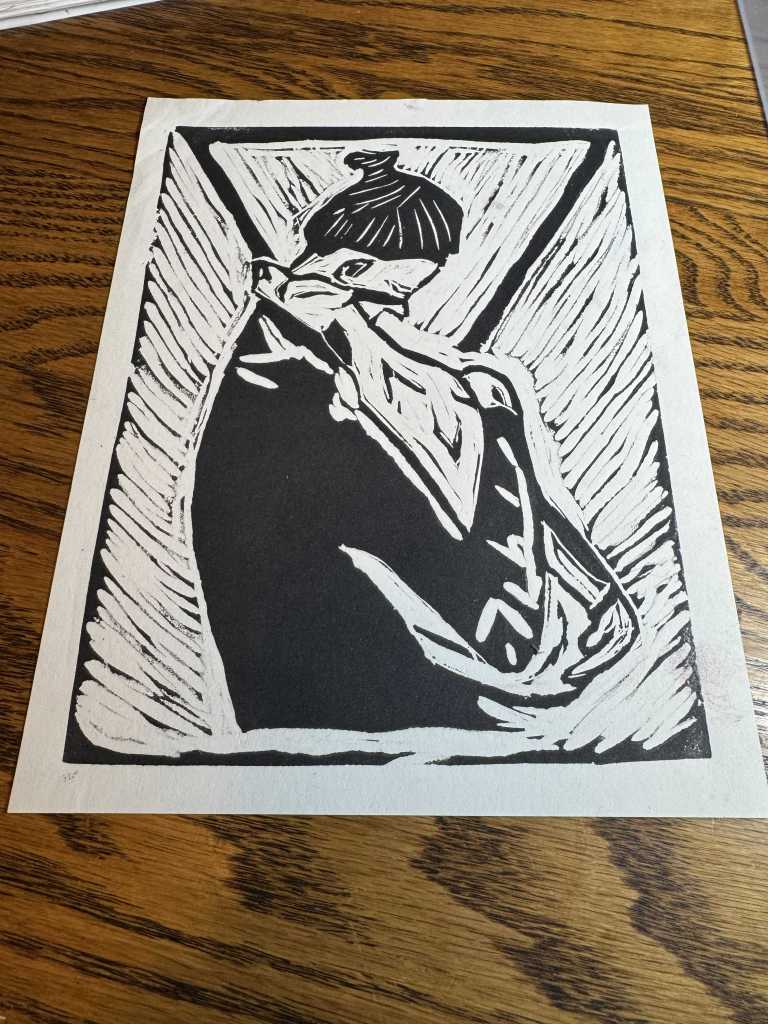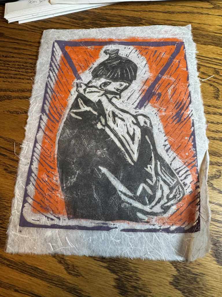 After Lily (Kim’s dog) passed away in 2024, I wanted to gift Kim with a memorial image, based on the last photo of them together. The image was carved in lino and I did a handful with different background colors via monotype. I ended up gifting a set of three different colorways and exhibited an orange and purple version at the printmaking student show at the Cultural Art Center in the summer.