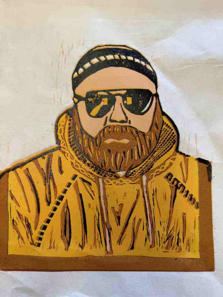 Four-color reduction print of a photograph of me from a photo-shoot at HOMAGE. This was hard but very satisfying and I really struggled with alignment of the different layers, so I only got a few good prints by the end.
